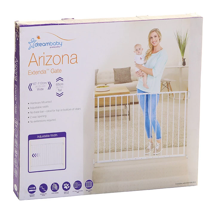 La barrière extensible Arizona de Dreambaby est une barrière à vis qui peut être étendue pour s’adapter à l’ouverture requise sans avoir à acheter d’autres extensions.