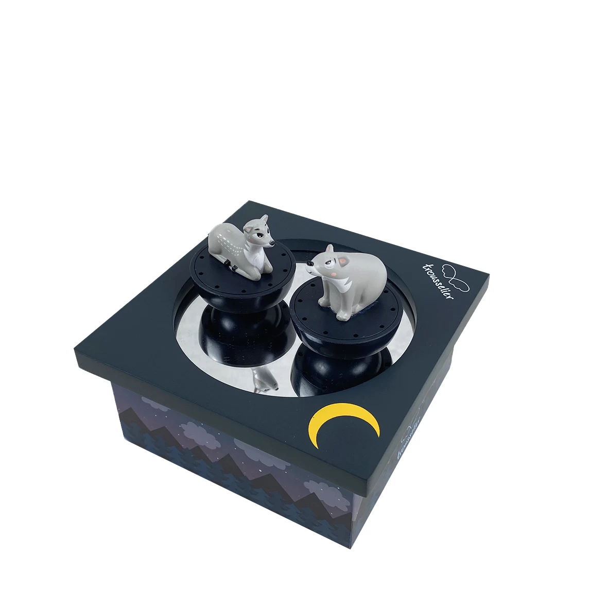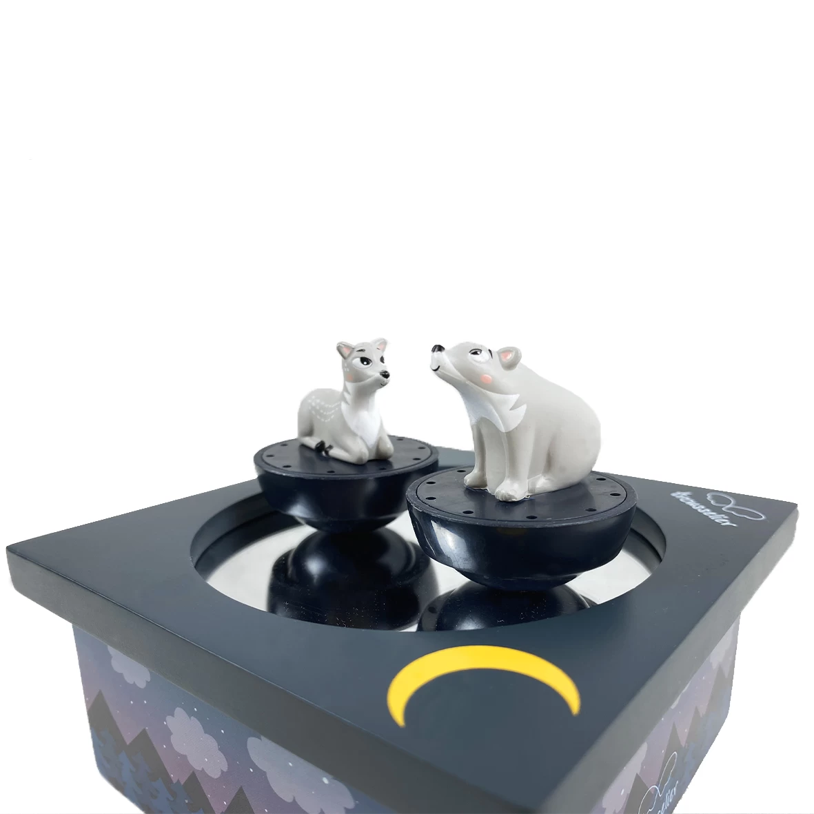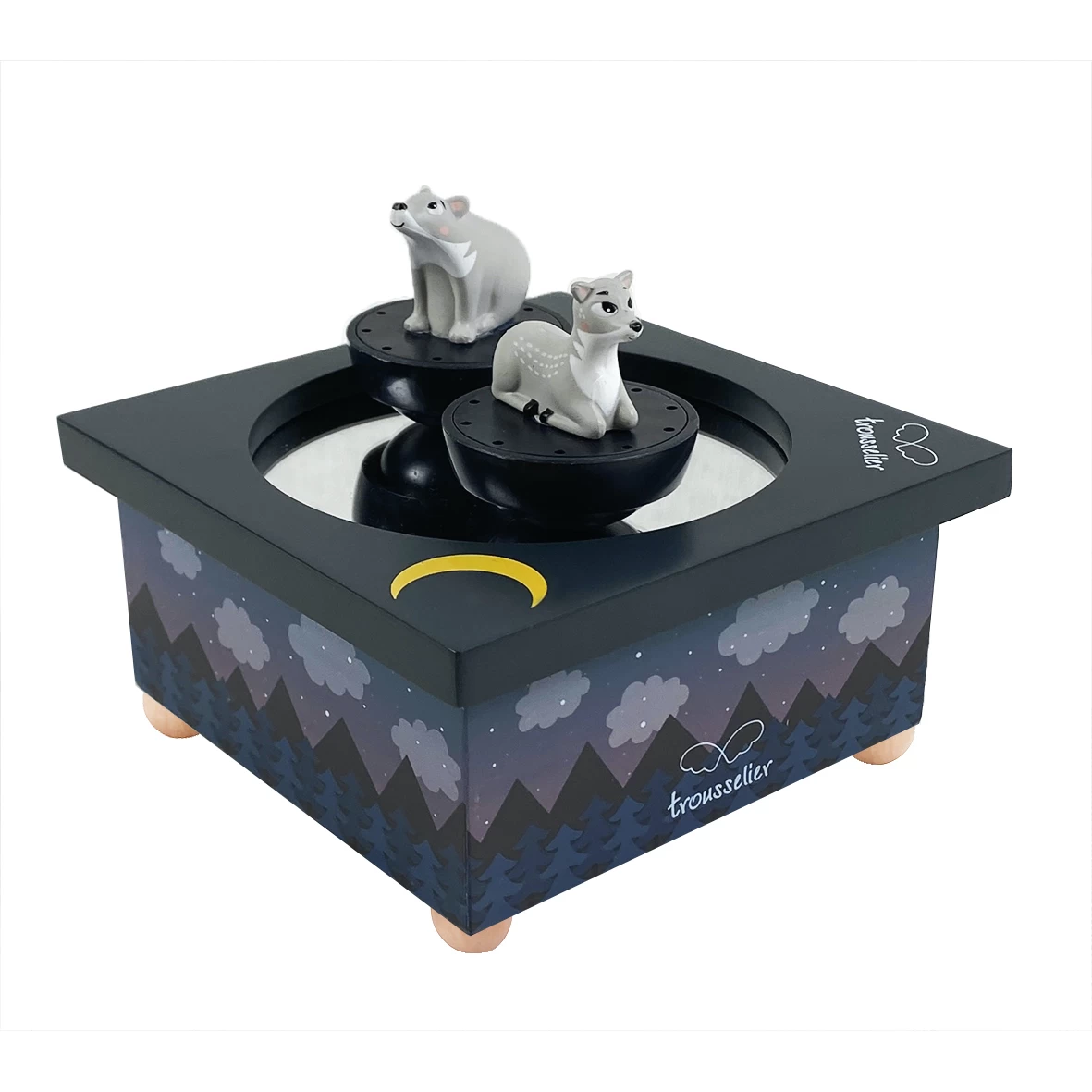 Cette jolie boite à musique en bois est accompagnée de 2 figurines aimantées. Cette boîte à musique très colorée est en peinture et sérigraphiée à la main. Ce jouet est conseillé pour les enfants à partir de 12 mois. Il faut actionner le mouvement musical situé en dessous de la boite puis mettre les figurines sur le « dancing » aimanté afin qu’elles puissent danser devant les yeux émerveillés de votre enfant.