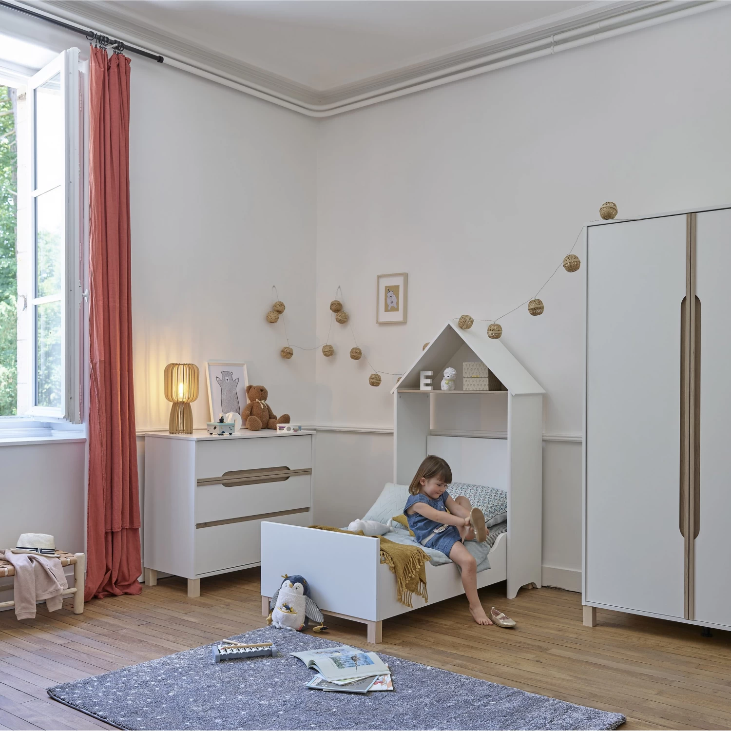 Autre spécificité de la gamme Céleste, la possibilité de transformer le lit en lui donnant une allure de cabane avec une tête de lit originale. D’autres meubles de rangement peuvent venir en renfort quand bébé manque de place pour ranger ses affaires : armoire, commode ou bibliothèque mobile.