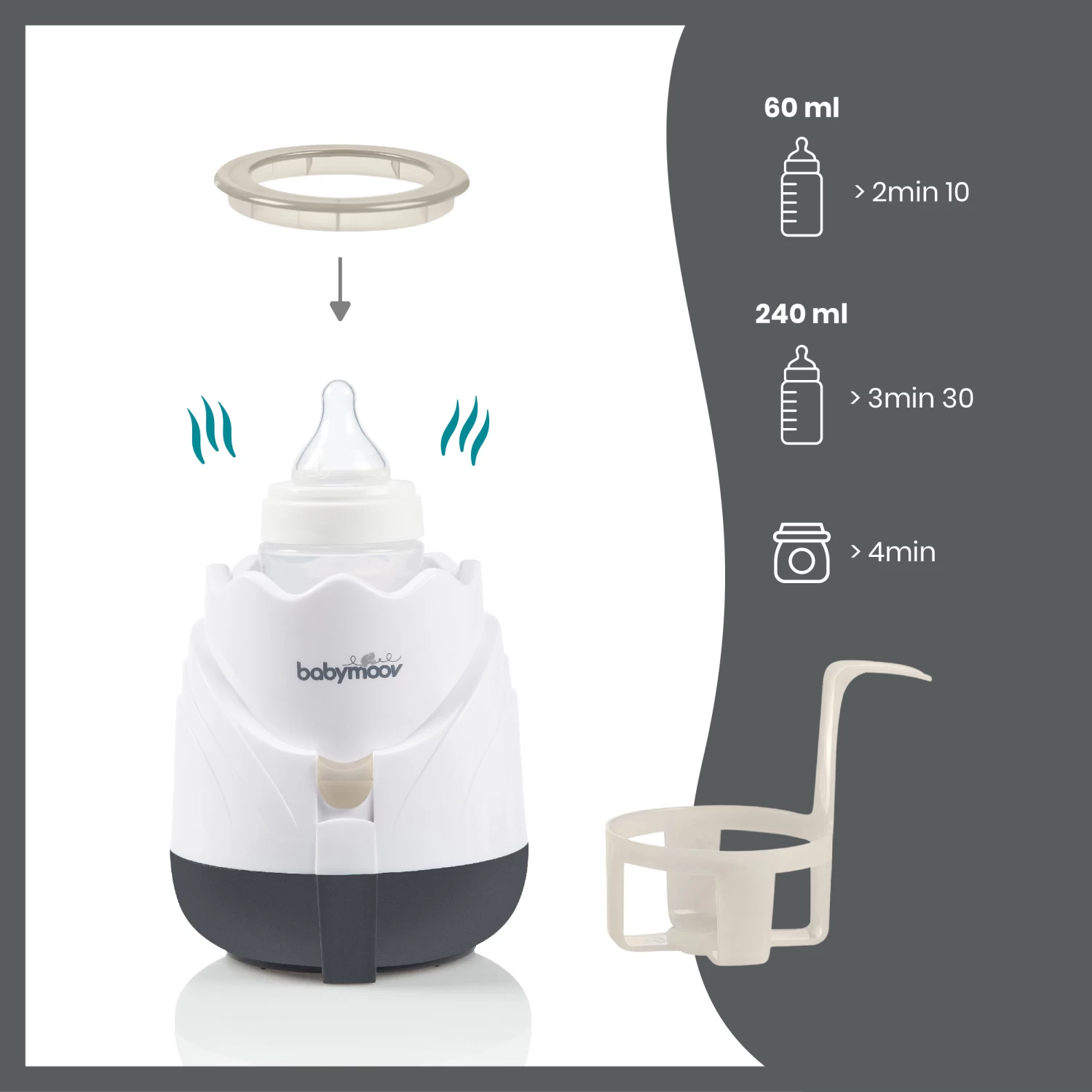 - Compatible avec tous les biberons du marché (col large jusqu’à 82mm) et anneau d’adaptation