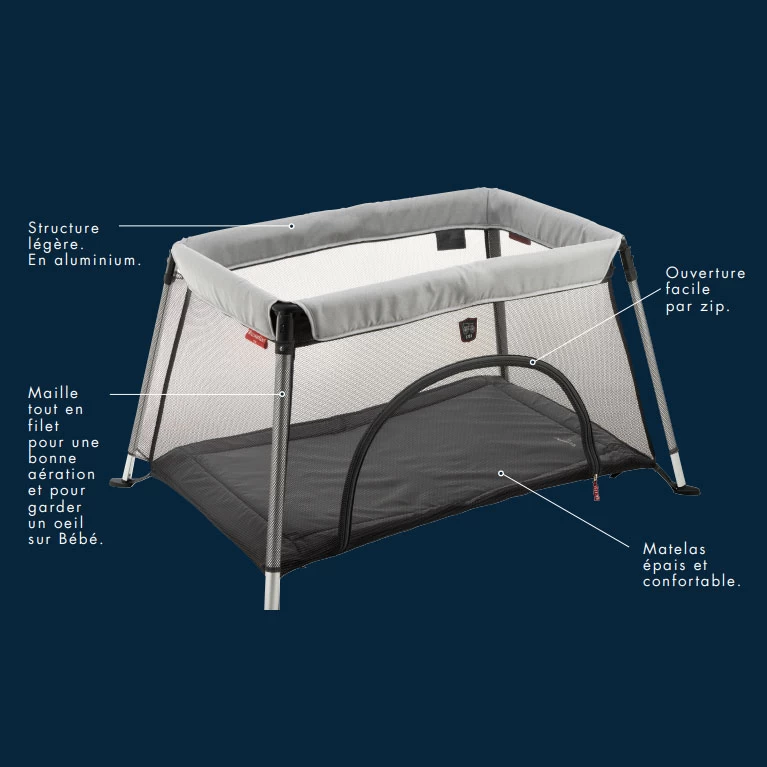 La structure en aluminium du lit, ultra-légère, son sac de rangement pour le transport et le stockage faciliteront les déplacements des parents.
