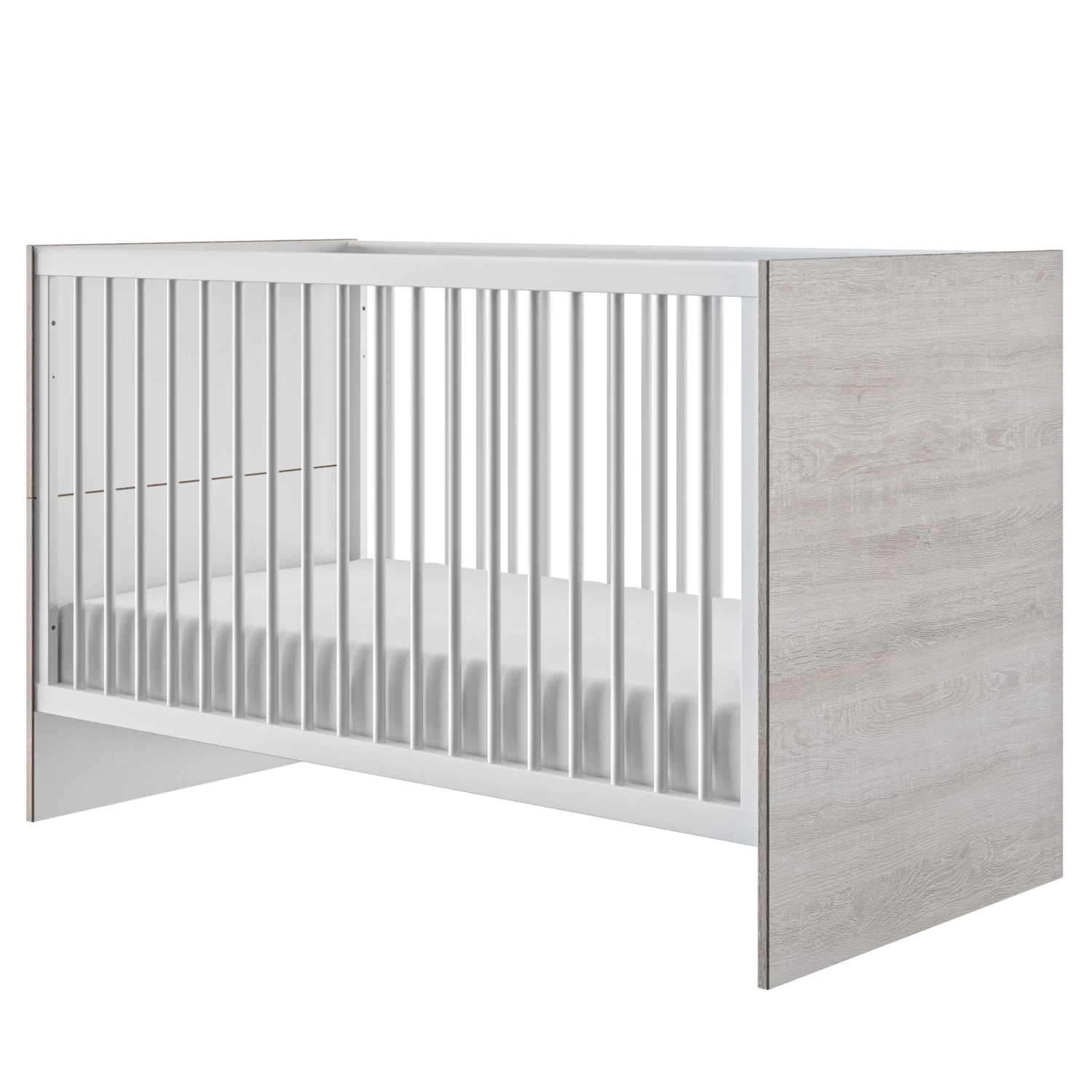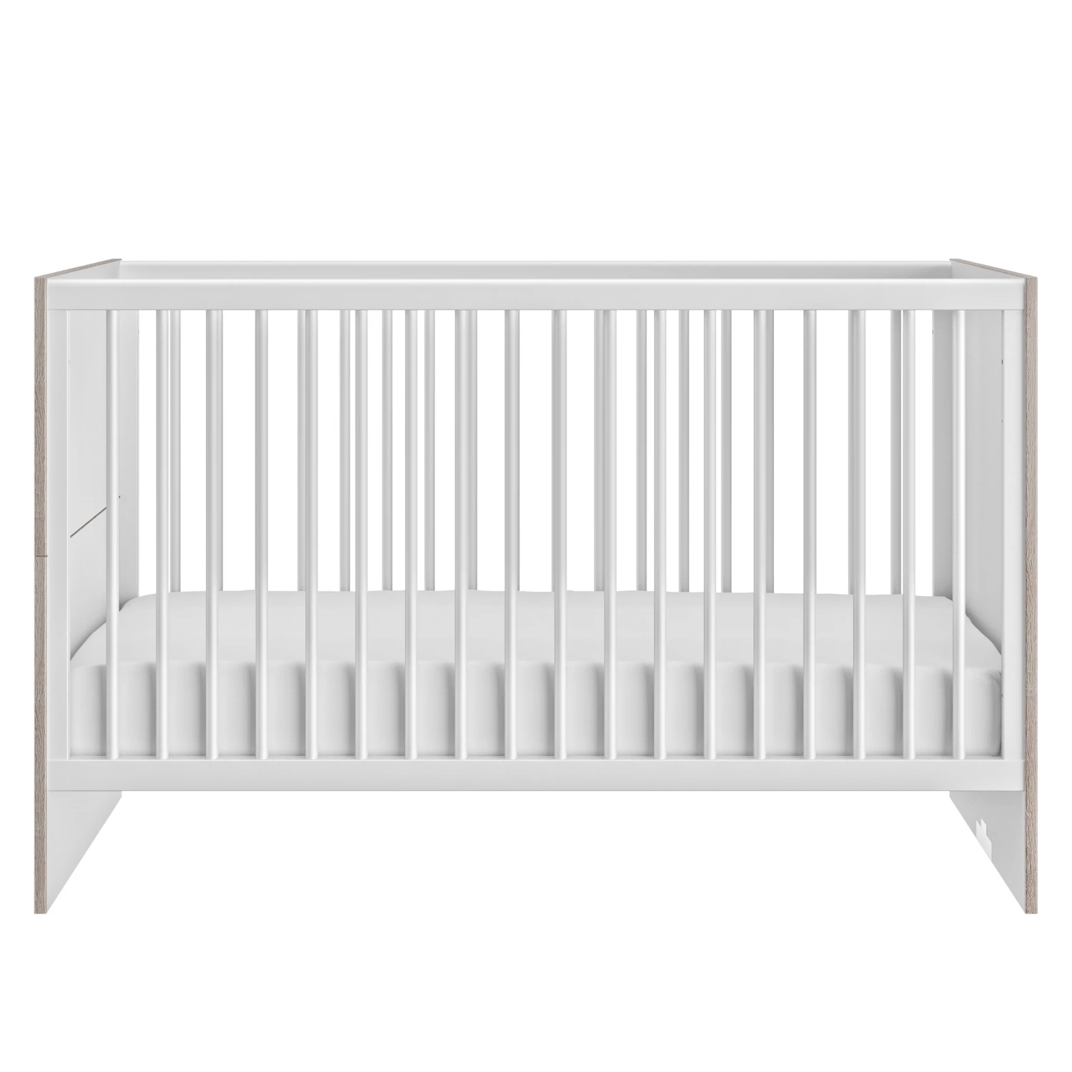 Lit 70×140 de la chambre Marius, transformable en lit junior grâce aux 2 pans (vendus séparément). Corps et façades : panneaux de particules revêtus papier uni Blanc et imitation Chêne cérusé, certains calibrés.