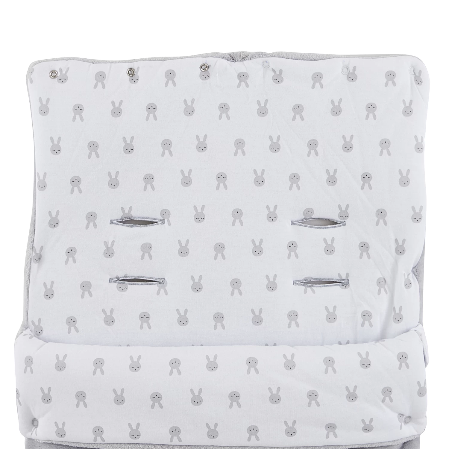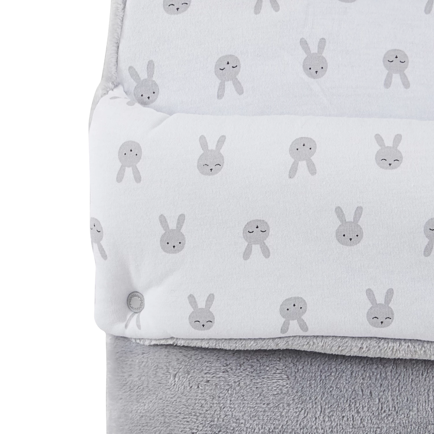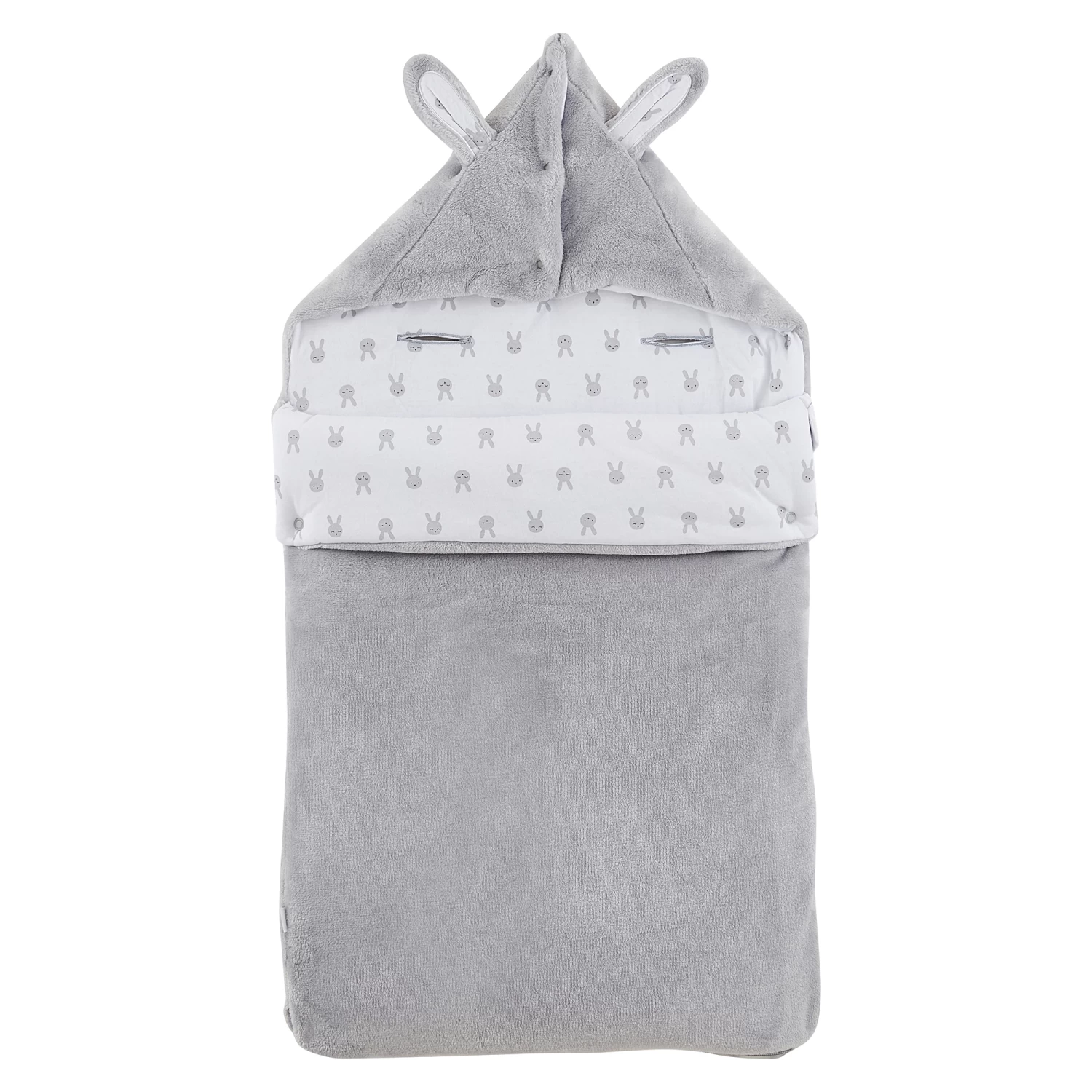 Nid d’ange P’tit bisou en velours à motifs jacquard tout doux en coloris gris. Cette pièce, qui est un joli sac de couchage pour tout petit bébé, est très chaude car doublée de jersey blanc avec son imprimé « petites têtes de lapins » en gris et en plus elle est doublée de ouate. Cet accessoire est très affectif et ludique avec sa grosse tête de lapin absolument craquant en fausse fourrure très douce devant. Bébé va adorer son beau doudou avec ses grande oreilles sur son nid d’ange. ! La capuche en forme pointue qui maintiendra la tête de bébé bien au chaud, peut être ouverte par les pressions pour avoir une forme plus plate.