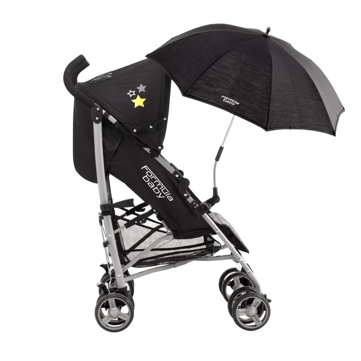 Ombrelle universelle orientable pour poussette, peut être détachée de son clip de fixation lors du pliage de la poussette.