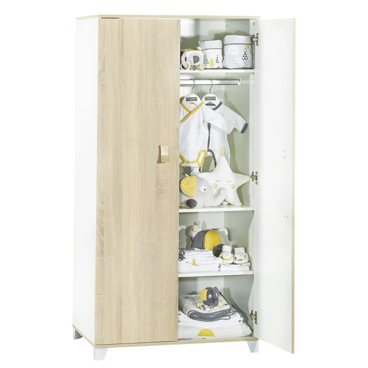Derrière ses 2 portes se cachent des rangements astucieux : de nombreuses étagères et une penderie pour y accueillir tous les indispensables de votre bébé.