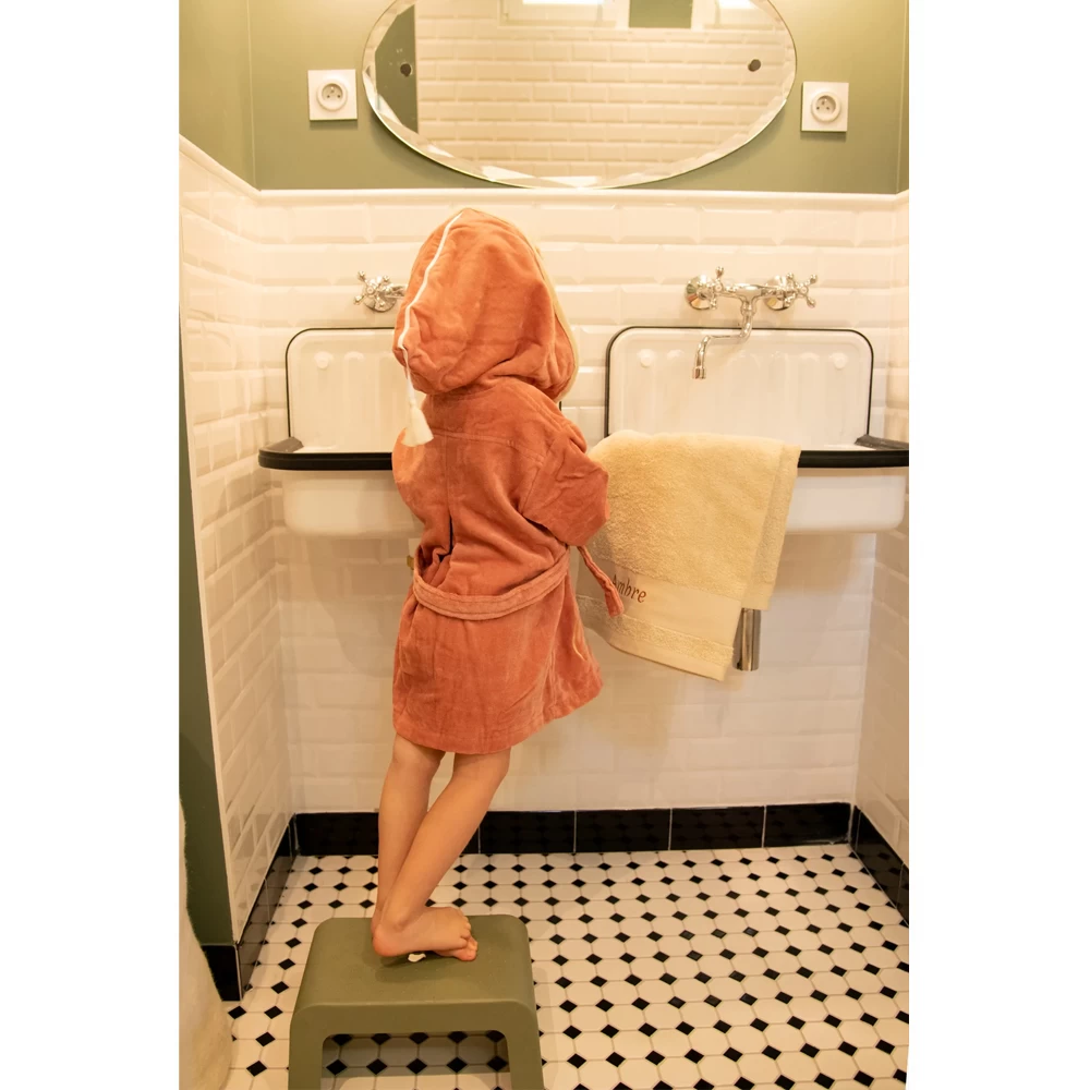 Un peignoir tout douillet de la marque L’Oiseau Bateau est en éponge velours brodé au prénom de l’enfant.