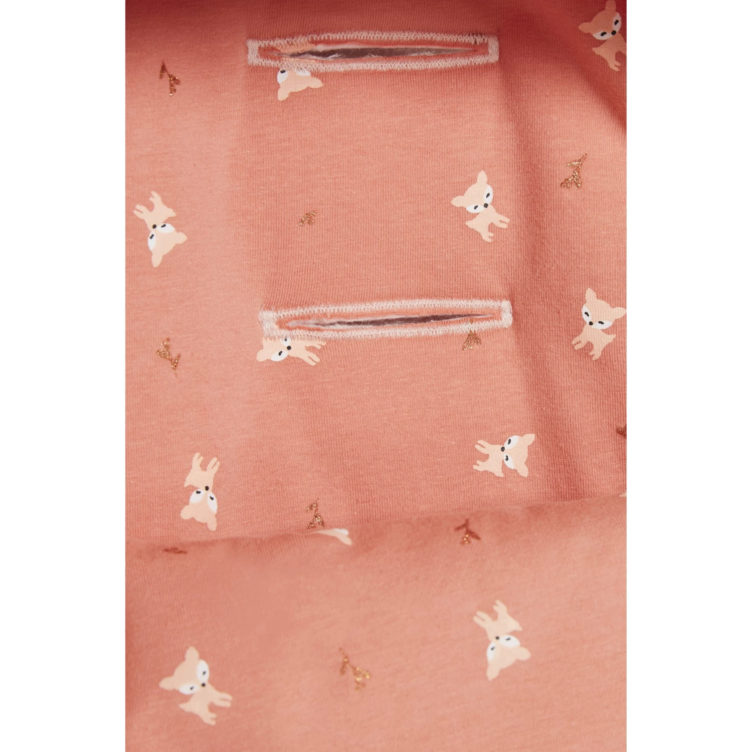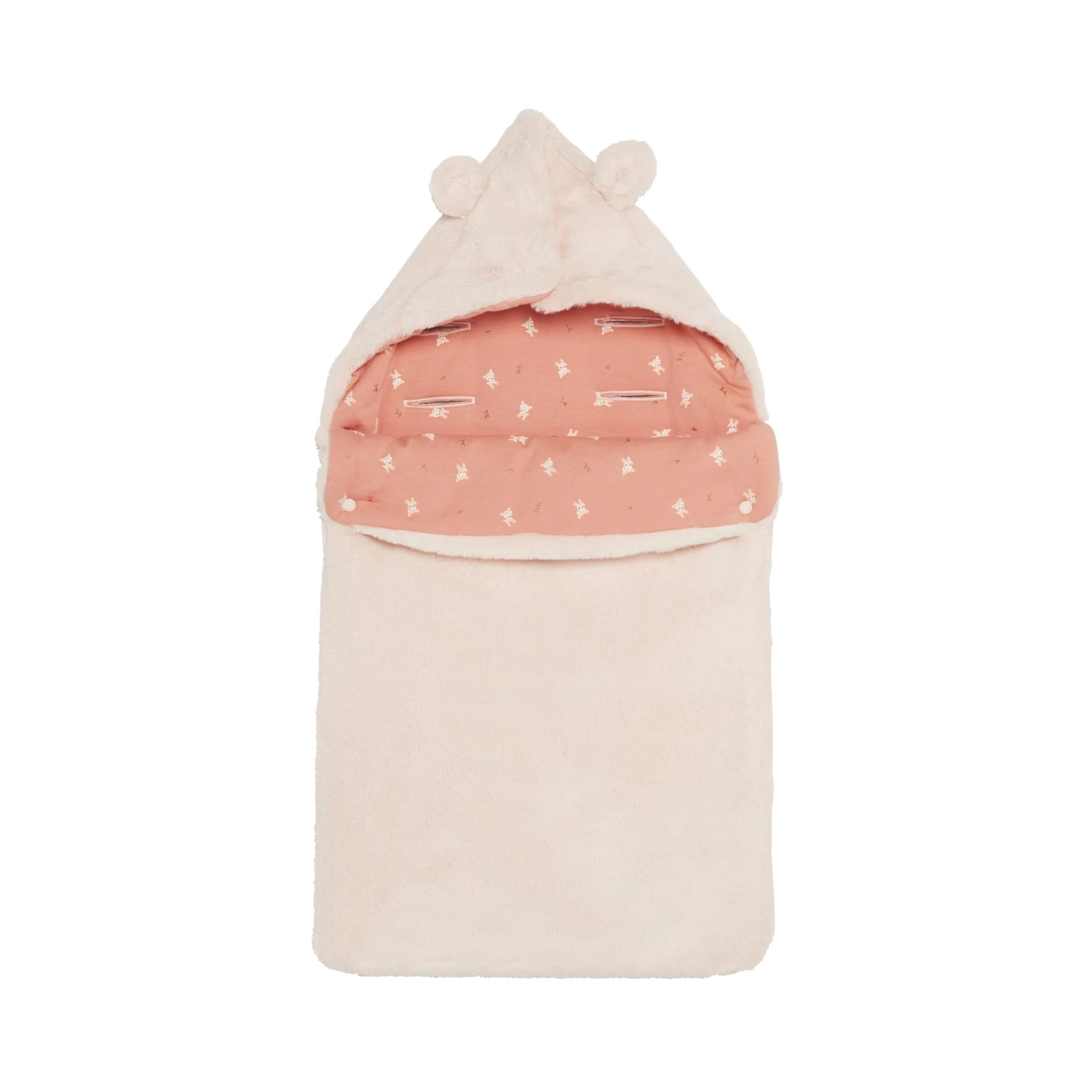 Nid d’ange P’tit Bisou en fausse fourrure rose pâle doublé de jersey à motifs petites biches.