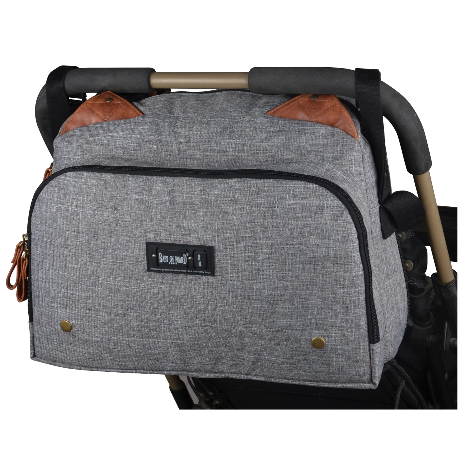 Toile légère et déperlante, il se porte à l’épaule ou en bandoulière et s’attache à la poussette.